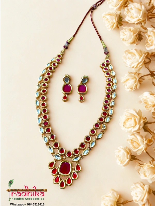 Why You’ll Love It:<p>Bold and breathtaking, this 2-layered Kundan necklace features a stunning combination of white and red Kundan stones, brought together in a richly traditional design. The handmade pendant adds a touch of artisanal beauty, while the matching earrings complete the look with elegance. A truly heavy, statement piece crafted for grand occasions, this set is perfect for weddings, festivals, or any moment that calls for unforgettable jewellery.</p>