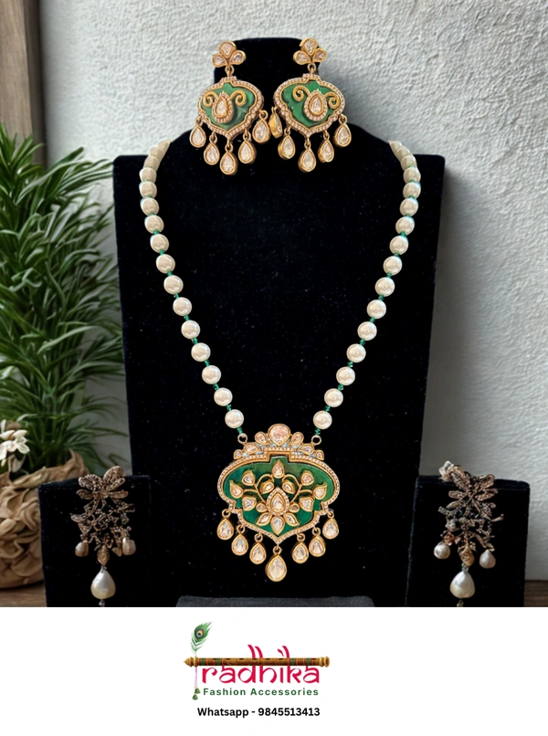Why You’ll Love It:This elegant pearl necklace set features a striking Kundan-studded pendant that takes center stage. Designed to draw attention, the pendant adds a regal charm to the soft sheen of pearls, while the matching earrings complete the look with subtle grace. It’s the perfect piece to elevate festive and ethnic outfits with refined sophistication.