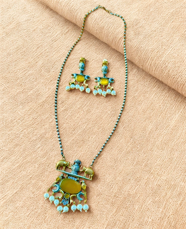 Oxidised metal chain necklace set features a bold pendant and matching earrings