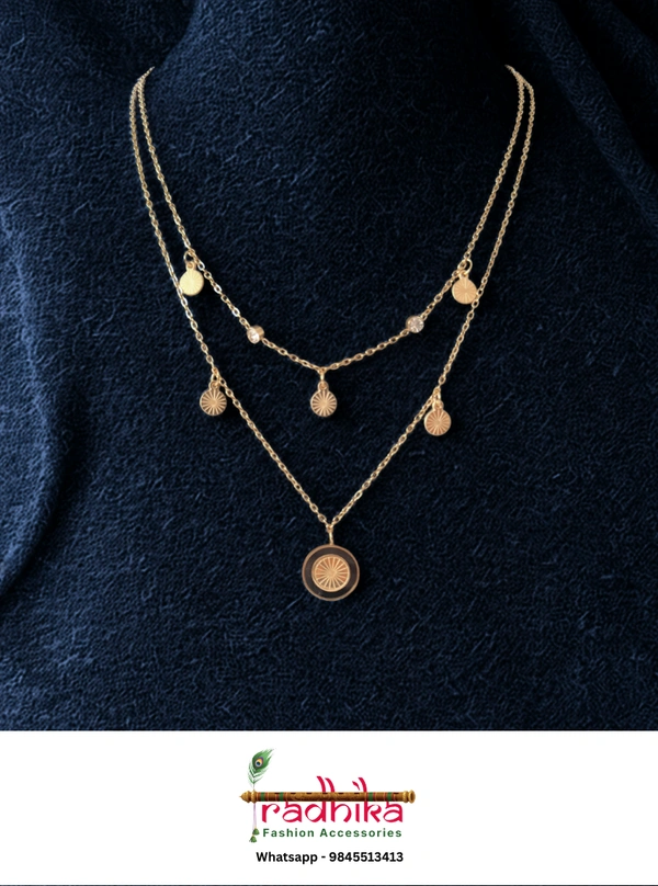 Why You’ll Love It:Achieve a perfectly curated look with this stunning two-layer gold-toned necklace. The shorter layer features a delicate golden charm, while the longer layer holds a striking circular pendant with a bold black and gold geometric design.