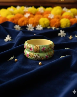 Why You’ll Love It:These vibrant bangles feature delicate floral motifs, each one hand-painted with precision and care. To add that extra bit of sparkle, we�ve accented the centers with shimmering stones. Whether you�re attending a Haldi ceremony or just want to brighten up a simple ethnic outfit, these bangles bring a cheerful, handcrafted charm that machine-made jewelry just can�t match.