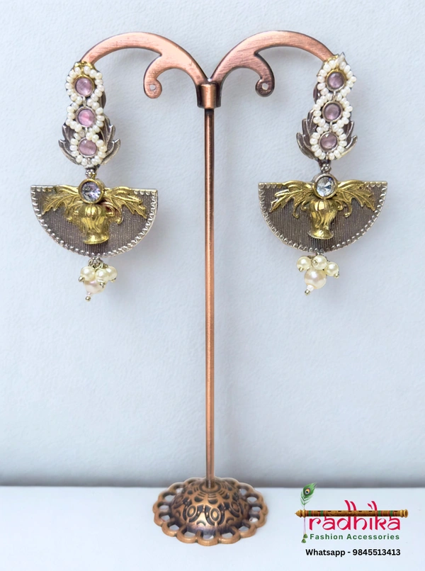 Why You’ll Love It:Delicately handcrafted, these oxidised and gold-tone dangler earrings are adorned with blush pink stones and luminous pearl accents, creating a look that's both bold and beautifully feminine. The contrast of antique silver with gold detailing gives it a rich, layered look — perfect for ethnic ensembles, festive wear, or adding a soft statement to everyday style.