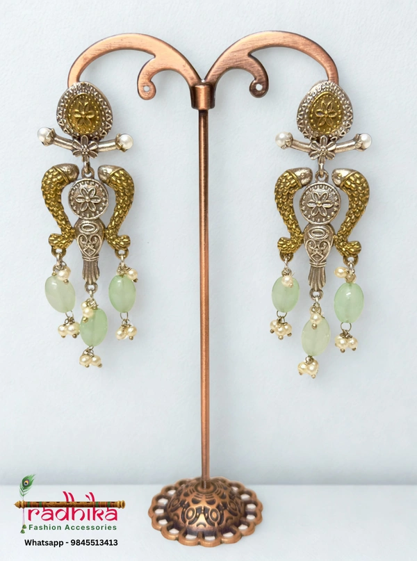 Why You’ll Love It:Celebrate craftsmanship with these oxidised and gold-toned dangler earrings, featuring a beautifully detailed fish motif and delicate bead accents. The fish, a symbol of abundance and good luck, brings meaning to the design, while the mix of oxidised and gold finish adds a touch of contrast and charm. Perfect for ethnic, boho, or festive looks, these earrings are a conversation starter you’ll love wearing.