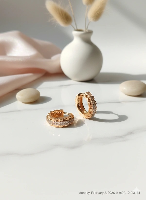 Why You’ll Love It:Rose Gold Scalloped Hoops featuring a bold, textured edge and two rows of shimmering American Diamond zircons.