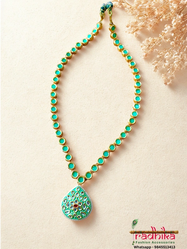 Why You’ll Love It:<p>This colored Kundan necklace is a celebration of tradition and color. Featuring vividly hued Kundan stones arranged in a refined setting, it comes with a matching pendant that adds depth and richness to the design. Whether worn for festive occasions or special gatherings, this piece is sure to turn heads with its elegant vibrance and cultural charm.</p>